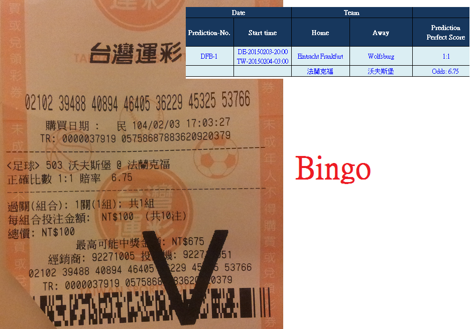 Bingo rate:100% (1/1) - Yaafeng's Bet on 2015/2/3