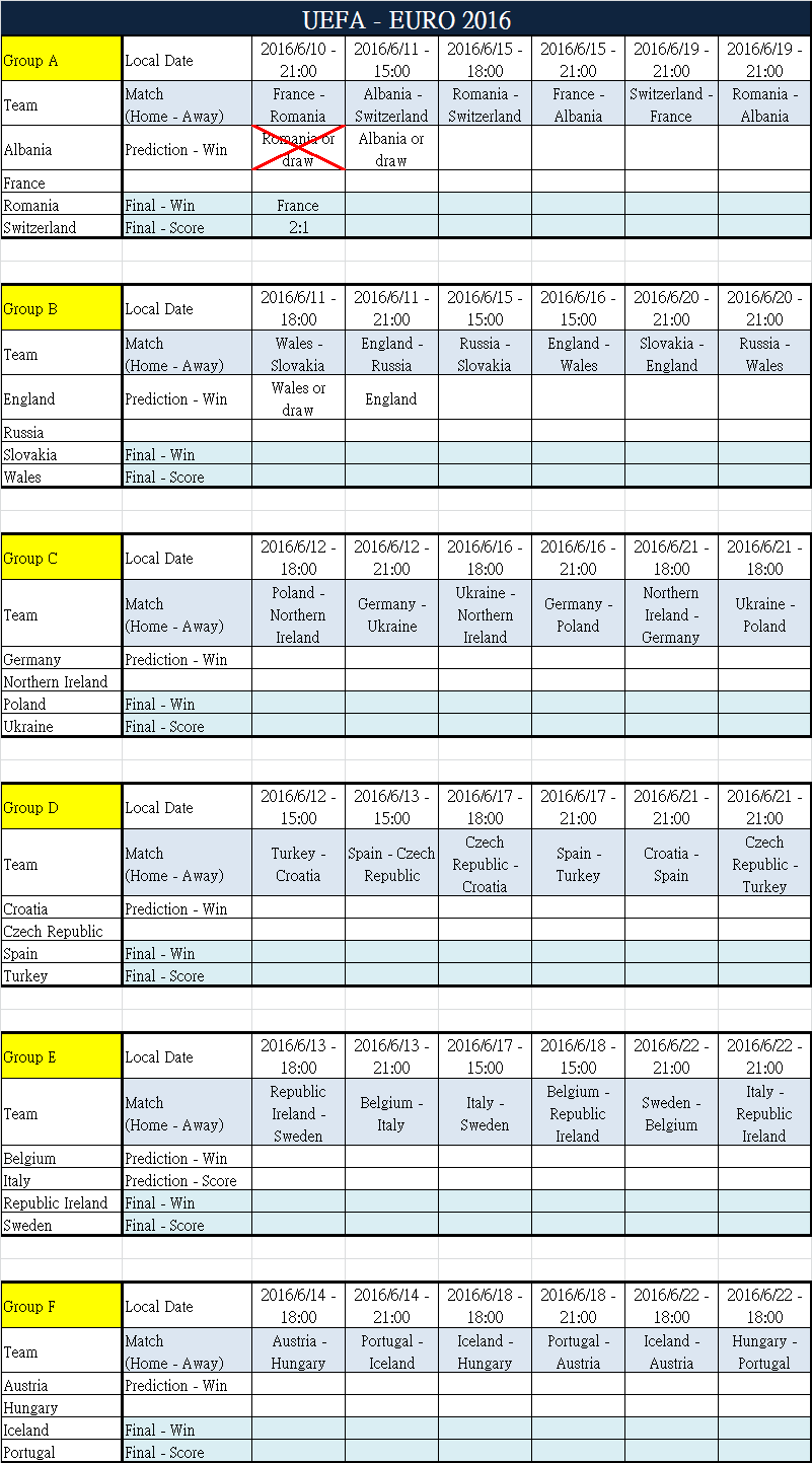 UEFA EURO 2016 Prediction on 2016/6/11