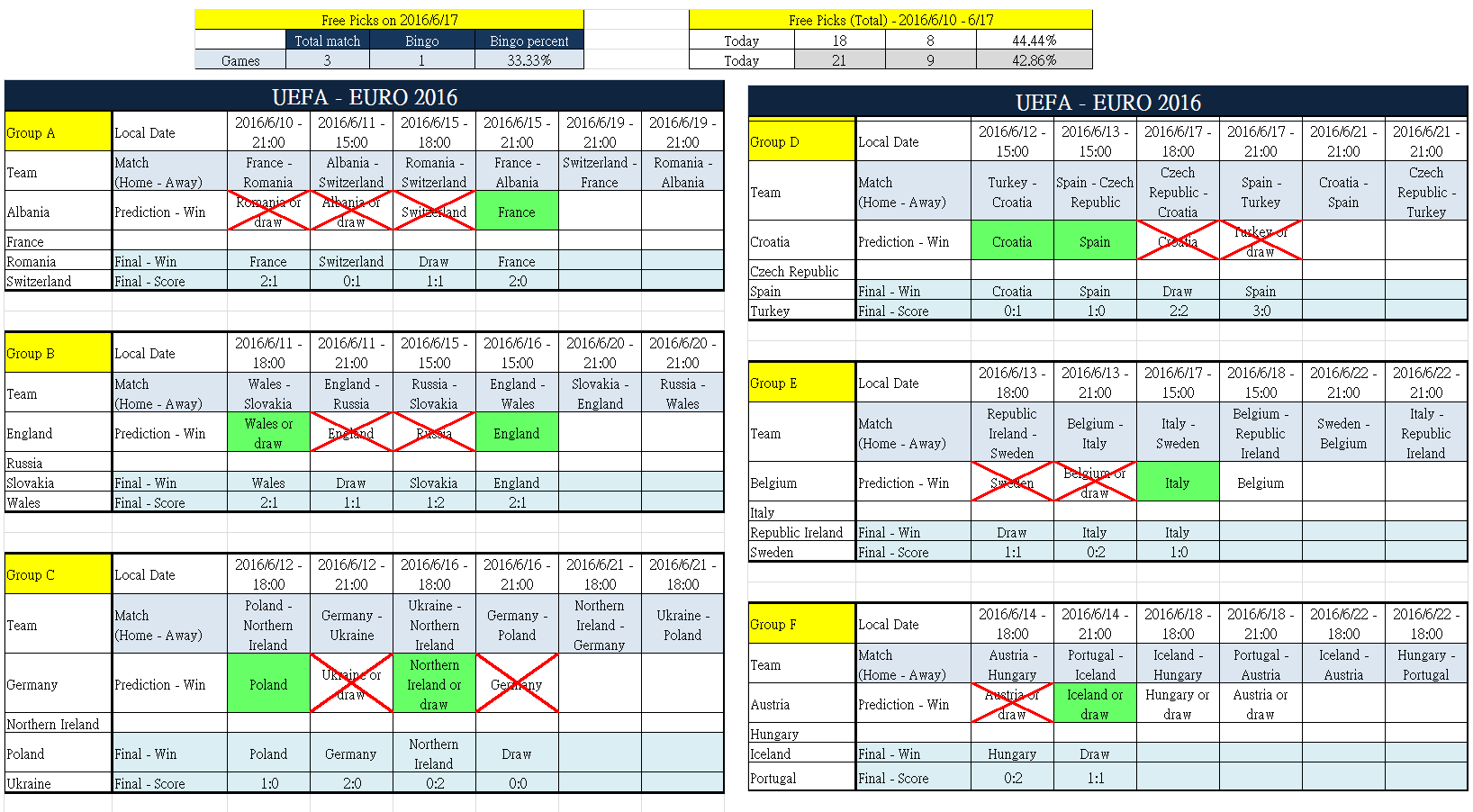 UEFA EURO 2016 Prediction on 2016/6/18